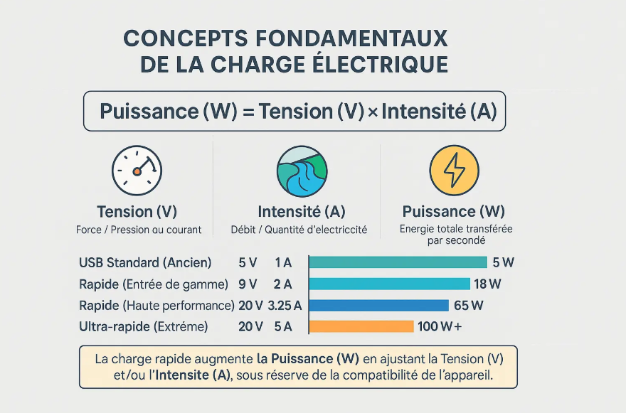 La puissance se calcule par W = V × A. Les chargeurs rapides augmentent soit la tension (9 V, 15 V, 20 V), soit l’intensité (jusqu’à 5 A) pour dépasser les 18 W considérés comme “rapides”.